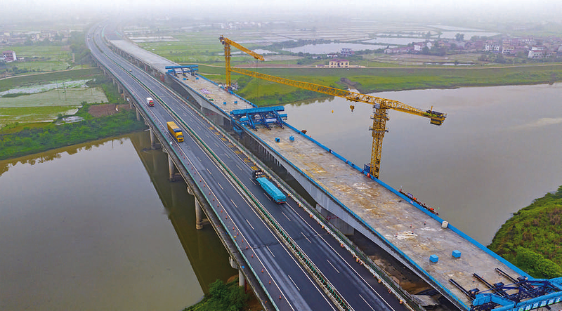 4月27日,江西省樟吉高速改扩建项目新余袁河特大桥全桥完成浇筑合龙(无人机照片)。