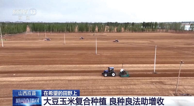 在朔州市应县大豆玉米带状复合种植全面铺开,种植过程中,合作社根据土壤和墒情,结合往年的种植经验,选取了适宜的玉米和大豆品种,同时还调整了种植技术。某种植专业合作社负责人段仁新向记者介绍说:“今年我们合作社种植的玉米套大豆,采取的办法是宽窄行种植,行距采用的是40厘米、70厘米的种植模式,玉米行距这边是40厘米,这是滴灌带的,这个宽窄行是70厘米。选种的时候采用的是127天的玉米种子,还有90天的大豆种子。尽量把种子它的生长习性和成熟时间融合到一块。”在改善种植方式的同时,合作社还因地制宜、精准施策,尝试运用新技术和新机械进行试种,通过良种、良法、良机的高效运用,实现农业增效。记者从应县农业农村局了解到,今年全县农作物种植面积116万亩,其中粮食作物面积85万亩,目前已播种玉米65万亩,全部种植工作预计在五月底结束。 据央视新闻