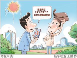 新华社北京电 中央气象台5月12日预报,12日至17日,黄淮中西部、华北南部及陕西关中等地将多高温天气。其中,16日至17日将迎来大范围35℃以上的高温天气,局地最高气温将达37℃以上。