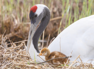 5月14日,在黑龙江扎龙国家级自然保护区,丹顶鹤雏鸟在亲鸟旁边玩耍。近日,黑龙江扎龙国家级自然保护区人工散养丹顶鹤迎来了繁育季,这里人工散养的丹顶鹤“夫妻”们“添丁进口”。