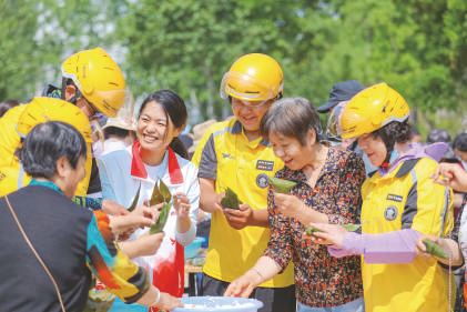 5月24日,在山东省青岛市城阳区城阳街道顺德居社区举办的迎端午主题活动中,外卖骑手和社区居民一起包粽子。端午节将至,各地举行包粽子、做香囊、龙舟竞渡等丰富多样的民俗活动,人们在浓浓的传统文化氛围中喜迎端午佳节。 新华社发 张鹰 摄