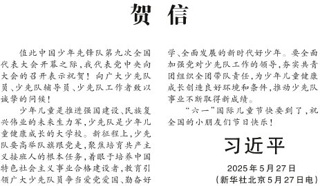新华社北京5月27日电“六一”国际儿童节即将到来之际,中国少年先锋队第九次全国代表大会27日上午在京开幕。中共中央总书记、国家主席、中央军委主席习近平发来贺信,代表党中央向大会的召开表示祝贺,向广大少先队员、少先队辅导员、少先队工作者致以诚挚的问候,并祝全国的小朋友们节日快乐。