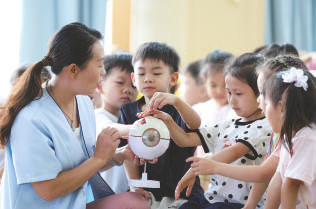 6月5日,在河北省石家庄市华北幼儿园,健康老师为孩子们讲解眼球结构。全国爱眼日将至,各地开展形式多样的活动,普及健康用眼知识,增强爱眼护眼意识。 新华社发 梁子栋 摄