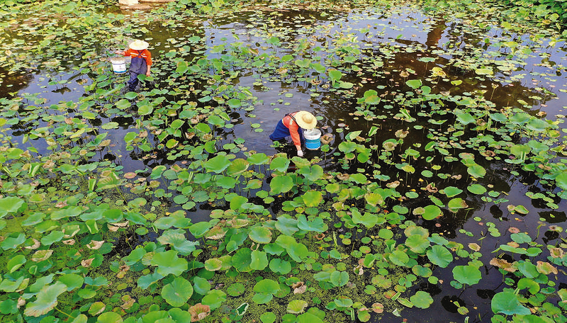6月5日,山东省青岛市即墨区环卫中心的河道保洁员在墨水河打捞水上漂浮物(无人机照片)。当日是世界环境日,各地举办丰富多彩的活动,倡议社会公众积极行动,投身美丽中国建设。 新华社发 梁孝鹏 摄