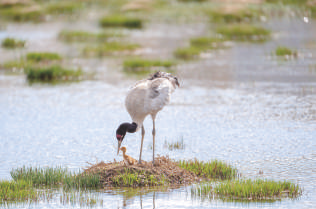 每年4月开始,就会有成对的黑颈鹤陆续迁徙至西藏那曲市申扎县,选择湿地环境繁衍下一代。图为6月5日拍摄的那曲市申扎县周边湿地里栖息的黑颈鹤和出生不久的小黑颈鹤。