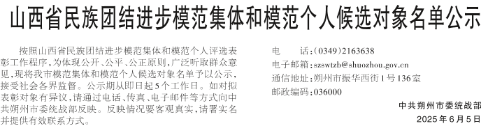 山西省民族团结进步模范集体和模范个人候选对象名单公示