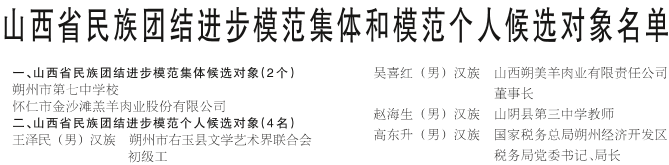 山西省民族团结进步模范集体和模范个人候选对象名单公示