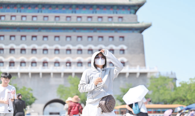 6月10日,一名在北京前门大街游览的游客拉扯衣服的帽子遮阳。近期,我国部分地区出现高温天气。 新华社记者 李鑫 摄