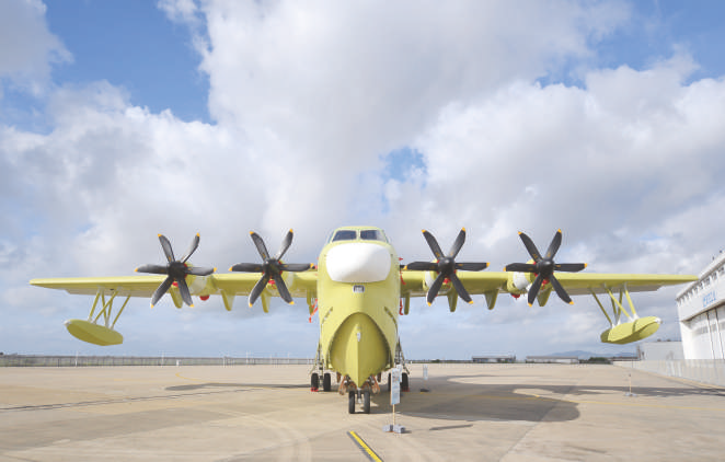 6月11日,在珠海中航通飞华南飞机工业有限公司,现场展示的批量生产的首架AG600飞机。当日,我国完全自主研制的大型水陆两栖飞机AG600“鲲龙”在广东珠海获颁中国民航局生产许可证,标志着AG600飞机正式迈入批量生产阶段。