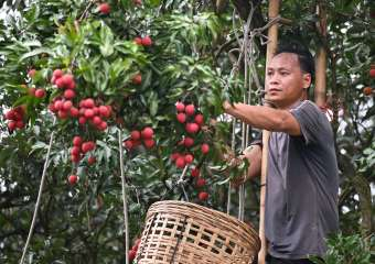 6月5日,在广东茂名高州市根子镇柏桥村,果农爬上梯子采摘荔枝。眼下正值荔枝集中上市季节,在“荔枝之乡”广东茂名高州市,荔果飘香,到处是一派繁忙景象。