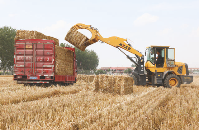 图为河北石家庄晋州市周家庄乡北捏盘村农户在麦田里将打包好的秸秆装车。 新华社发 梁子栋 摄