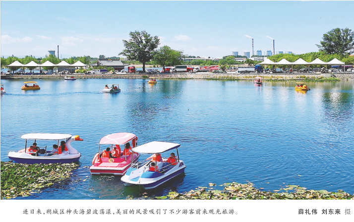 夏日朔州,天空湛蓝澄澈,河流碧波荡漾,倒映着沿岸建筑与绿树鲜花,幸福的人民与天之蓝水之美和谐共生。
