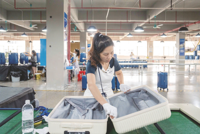 6月23日,在蓝山县皮具箱包科技产业园一家箱包生产企业,工人在检查拉杆行李箱质量。近年来,湖南省永州市蓝山县依托区位优势和产业基础,深耕皮具箱包制造等产业,现有相关企业170余家,已具备年产拉杆箱500万个、手提包背包1000万个的产能规模,2021年获评“湖南省皮具箱包特色小镇”。2024年全县皮具箱包产业实现产值95亿元,完成税收7668万元。 新华社记者 陈思汗 摄