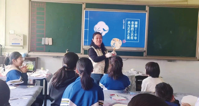 漆扇是以扇子为载体,运用漆器工艺制作而成的艺术品。近日,怀仁市第二中学校组织学生开展了“漆扇与书法艺术碰撞”主题活动。经过调漆、滴漆、拨动漆液形成纹路……最后在扇面上书写,一把把独一无二的漆扇作品就新鲜出炉了。图为学校国画特色工作坊的肖燕老师为同学们详细讲解漆扇工艺。 王荣 王晓丽 摄