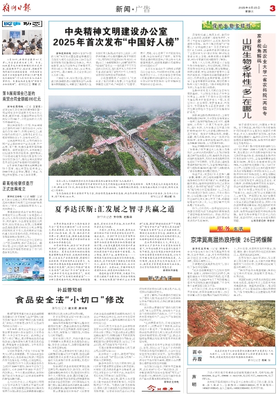 数千年华夏文明的历史长河中,“和谐共生、道法自然”的文化基因已刻入三晋大地。崔绍朋认为,保护生物多样性、持续守护丰富的生物种质资源,不仅是美丽山西建设的底色,同时可为我省林草高质量发展、特色植物研究和利用、小杂粮产业、道地药材生产、畜禽放养、食药用菌栽培提供可持续资源保障。保护生物多样性不仅是对自然的责任,也是对后代子孙未来永续发展的保障。 山西日报记者 李全宏