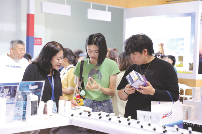 7月6日,一名韩国客商(前左一)在兰洽会上向参会嘉宾推介商品。