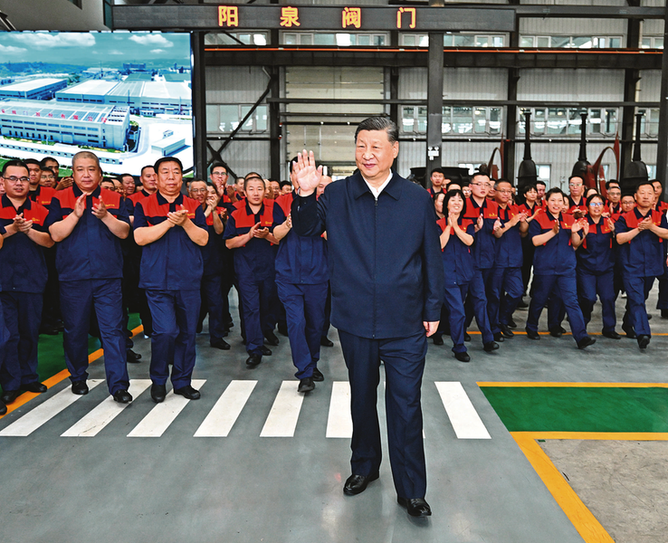 7月7日至8日,中共中央总书记、国家主席、中央军委主席习近平在山西考察。这是7日下午,习近平在阳泉阀门股份有限公司考察时,同企业员工在一起。 新华社记者 燕雁 摄