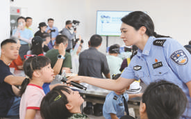 7月8日,平安广州宣讲团民警提问小朋友安全知识。当日,广州市公安局“平安广州宣讲团”组织学生等走进市公安局水上分局,近距离感受水上警察装备和救援技能,在互动体验中学习安全知识。 新华社记者 邓华 摄