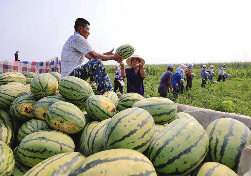 图为河北省唐山市丰南区东田庄镇大吴庄户村的农民在田间收获西瓜。