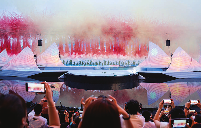 游客在湖南省浏阳市天空剧院拍摄“焰遇浏阳河·仲夏花火夜”创意焰火秀。