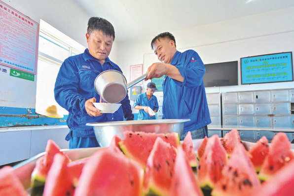 7月13日,在天津长芦海晶集团有限公司的盐田作业现场,工人在休息区领取绿豆汤纳凉解暑。