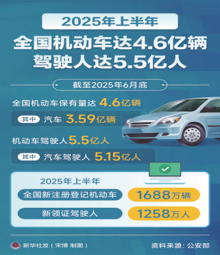 新华社北京电 (记者 任沁沁)公安部7月14日发布最新统计,截至2025年6月底,全国机动车保有量达4.6亿辆,其中汽车3.59亿辆;机动车驾驶人5.5亿人,其中汽车驾驶人5.15亿人。2025年上半年全国新注册登记机动车1688万辆,新领证驾驶人1258万人。