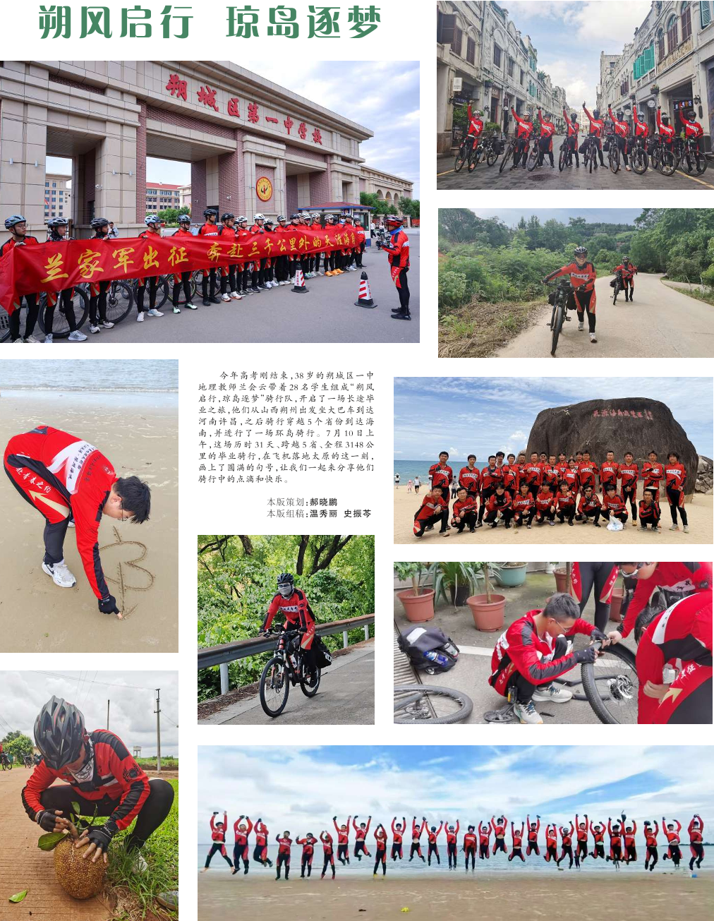 今年高考刚结束,38岁的朔城区一中地理教师兰会云带着28名学生组成“朔风启行,琼岛逐梦”骑行队,开启了一场长途毕业之旅,他们从山西朔州出发坐大巴车到达河南许昌,之后骑行穿越5个省份到达海南,并进行了一场环岛骑行。7月10日上午,这场历时31天、跨越5省、全程3148公里的毕业骑行,在飞机落地太原的这一刻,画上了圆满的句号,让我们一起来分享他们骑行中的点滴和快乐。