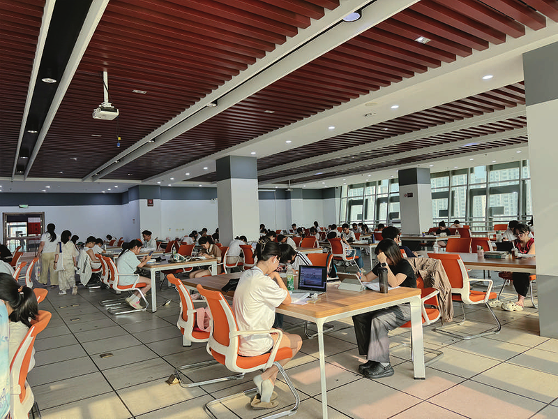 备考大军沉浸“知识海洋”。在三楼的自习室,备考研究生的张明在笔记本上奋笔疾书,字迹密密麻麻:“这里学习氛围浓厚,看到身旁人都在拼搏,自己也不敢有丝毫懈怠。”相邻座位上,公务员考生李萌专注刷着行测真题,头也不抬:“空调舒适、网络稳定,学习氛围也好。”