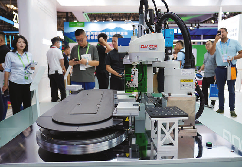 7月17日,在数字科技链展区,参观者在苹果电池供应商欣旺达展台参观磁悬浮输送产线展示。