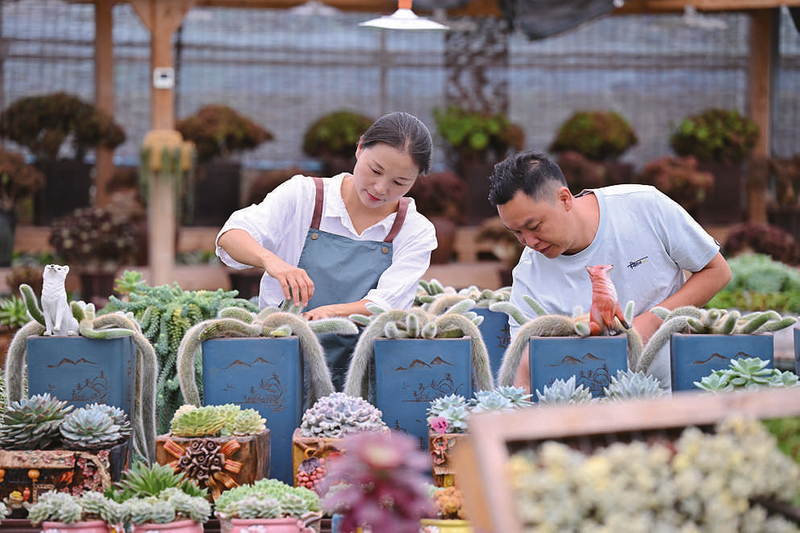 近日,在周宁静宇园艺有限公司多肉种植大棚,刘林(左)与丈夫张云昌共同打理多肉盆栽。时值暑期旅游旺季,走进福建周宁静宇园艺有限公司多肉种植大棚,一盆盆形态各异的多肉植物憨态可掬,公司负责人刘林正忙着接待一批又一批前来参观、研学的客人。 新华社记者 姜克红 摄
