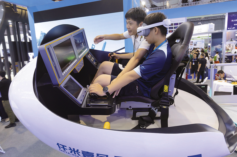 7月23日至26日,2025国际低空经济博览会在上海举办,以“启航低空经济,赋能千行百业”为主题,参展商数量近300家,展示低空基础设施、制造与配套服务等。图为一名参观者在工作人员的指导下体验模拟飞行。