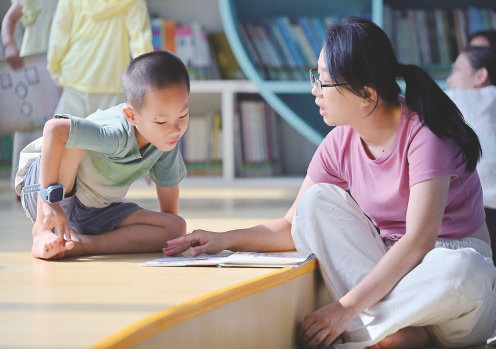8月3日,家长带着孩子在位于海口市的海南省图书馆读书。