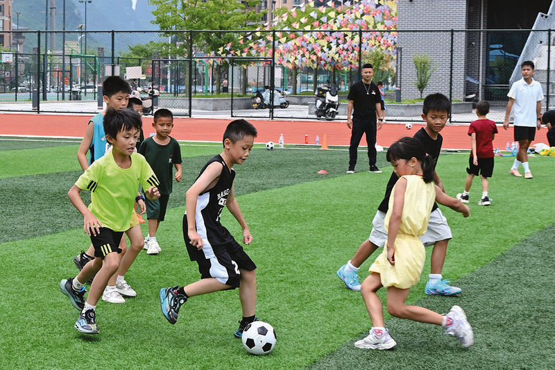 8月10日,在广西河池市罗城仫佬族自治县体育中心足球场,小朋友在踢足球。暑假期间,各地孩子参加丰富多彩的文化体育活动,充实假期生活。 新华社发 韦如代 摄