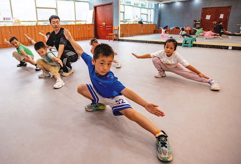 8月11日,在广西南宁市兴宁区文化馆,体育老师指导小学生进行武术基本功练习。暑假期间,孩子们参加丰富多彩的活动,度过一个充实快乐的假期。新华社发 赵京武 摄