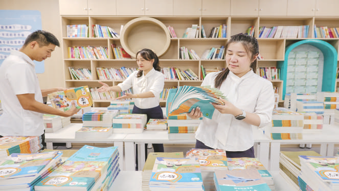 8月16日,在湖北省武汉市未来实验小学美林校区,教师在整理新教材。新学期开学临近,各地做好教材的接收、分发等工作,为开学做好准备。