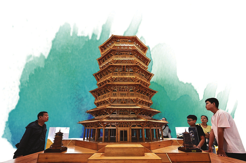 8月23日,第七届山西文化产业博览交易会朔州市展区,游客正仔细欣赏应县木塔模型,从中探寻山西古建魅力。 山西日报记者 杨晨玉 摄