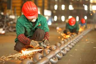 8月25日,青岛锚链股份有限公司工人在生产出口到海外市场的锚链产品。连日来,该公司工人加班加点赶制出口到海外市场的“订单锚链”产品,满足客户需求。