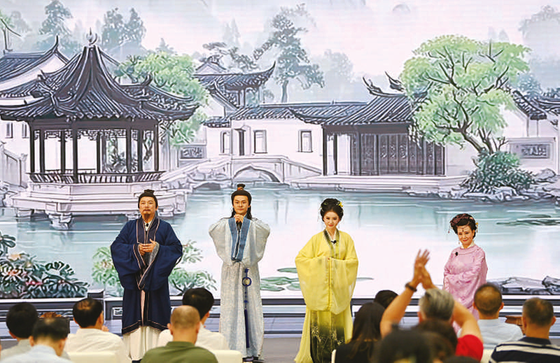 演员在新闻发布会上表演话剧《钗头凤》片段。