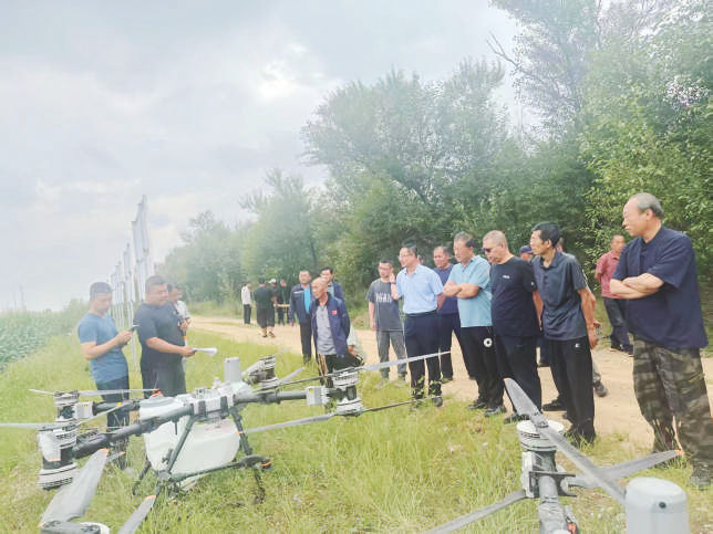 近日,在朔城区高升农机专业合作社的试验田里,一场别开生面的“病虫害绿色防控田间课堂”正在上演——没有黑板粉笔,取而代之的是嗡嗡作响的无人机、闪着蓝光的太阳能杀虫灯,还有挂在玉米秆上不起眼的小卡片……来自全区各乡镇的种粮大户代表、农机合作社负责人、农技人员共计50余人一起观摩学习。