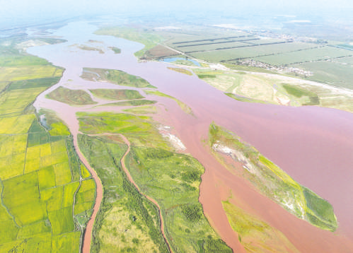 这是9月6日在宁夏石嘴山市平罗县境内拍摄的黄河滩涂湿地和稻田(无人机照片)。秋日时节,在黄河宁夏石嘴山段,蜿蜒曲折的河道与黄绿色的稻田构成一幅美丽的画卷。