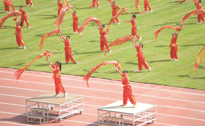 在国家体育场,学生们参加龙操展演。9月9日,北京第二实验小学教育集团第三届体育节暨北京市2025年中小学“学练赛一体化”体育教学改革阶段性成果展示在国家体育场“鸟巢”举行,万名师生和家长在这座双奥殿堂共上一堂“体育大课”。 新华社记者 任超 摄