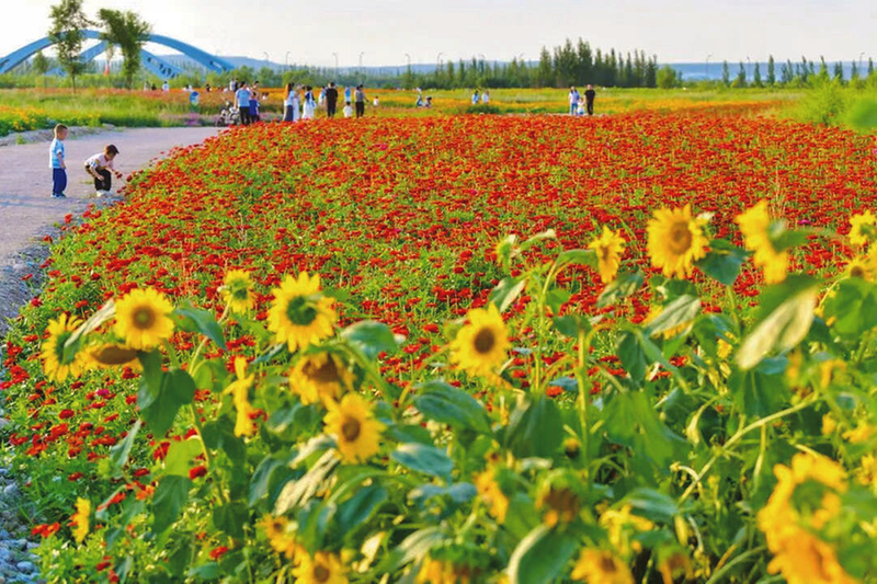 从高空俯瞰,不同颜色的花田有序分布,红色花朵热烈似火,黄色花朵明亮耀眼。微风拂过,成片的花儿轻轻起伏,一幅灵动的动态画卷就此展开;花田间,蜿蜒道路穿插其间,为游客穿梭游览、饱览花海美景提供了便利。远处,澄澈蓝天、悠悠白云与花海相映成趣,更让这片景致溢满诗意。