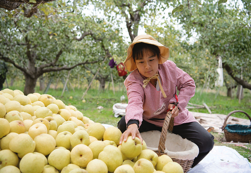 9月18日,在安徽省宿州市砀山县一处梨园内,梨农在分拣酥梨。