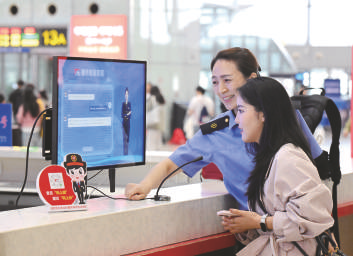 在河北石家庄火车站候车大厅服务台,旅客向“AI智能客服机”问询旅行信息。