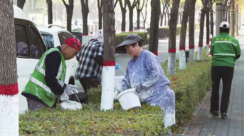 在市区安泰街两侧,园林养护工人正忙着为行道树“涂白”,粉刷过的树木涂白高度统一、颜色均匀,就像给树木穿上了白色的新衣。据园林绿化人员张文月介绍说:“安泰街树木刷白,高度为1.1米,每天进度是26桶左右,用的是增白、防虫、防冻新型液体。”