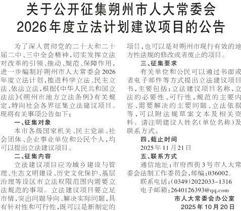 关于公开征集朔州市人大常委会2026年度立法计划建议项目的公告