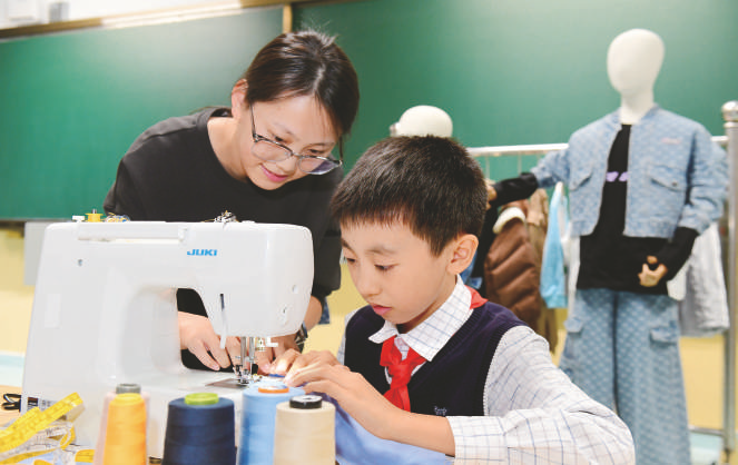10月22日,在济南市历下区燕山小学,老师指导学生学习直线缝合技能。今年9月,山东省济南市历下区燕山小学为进一步提升学生们的劳动素养和跨学科能力,在服装设计、环保时装秀等社团活动的基础上,与山东鸿天集团合作引入缝纫制作课,引导学生感受服装设计制作的乐趣。 新华社记者 郭绪雷 摄