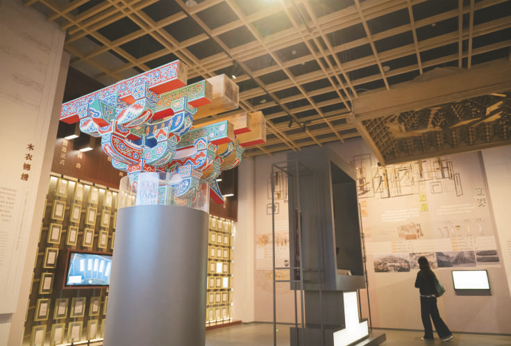 观众在中国建筑科技馆古代建筑展厅参观。11月4日,位于武汉的中国建筑科技馆古代建筑展厅以全新面貌开放参观。展厅优化了展陈形式与参观动线,丰富了展品和内容,通过文物、模型、多媒体互动设备等,展现中国古代建筑技艺的灿烂成就。