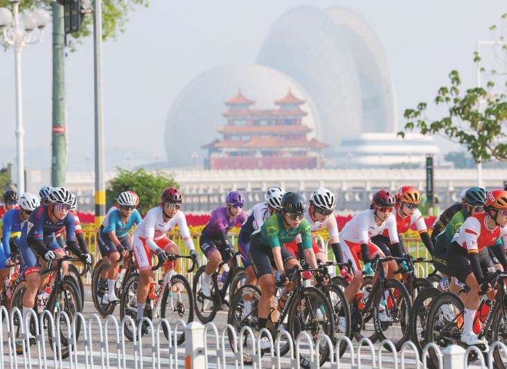 11月9日,参赛选手在比赛中经过珠海城市地标“日月贝”。当日,第十五届全国运动会公路自行车女子个人赛决赛举行。 新华社记者 梁旭 摄