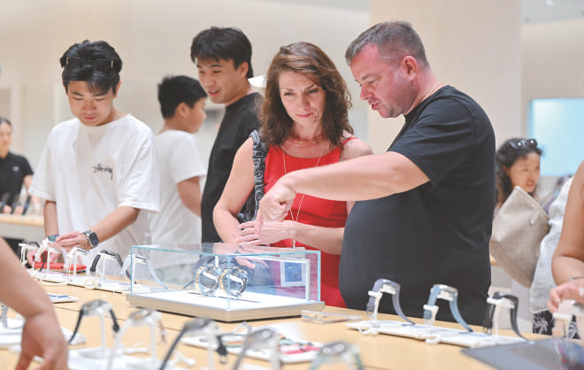 图为11月9日,外国顾客在三亚国际免税城选购商品。新政将适用人群扩至离境旅客。海南离岛免税新政实施首周,旅游消费市场持续升温。据海口海关统计,11月1日至7日,海口海关共监管海南省离岛免税购物金额5.06亿元。 新华社记者 郭程 摄